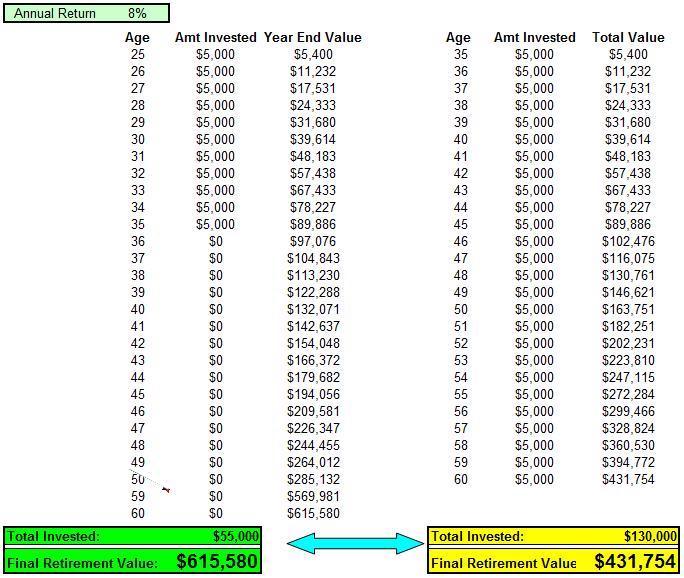 If you start saving at 25 (which I’m sure some of you are even younger than that) and save $5,000 a year for the next 10 years you’ll end up with more money at age 60 than if you start saving $5,000 a year from age 35 to 60. And not just a little bit more. Almost $200,000 more! That’s a lot of trucks, X-Boxes, and speaker systems.