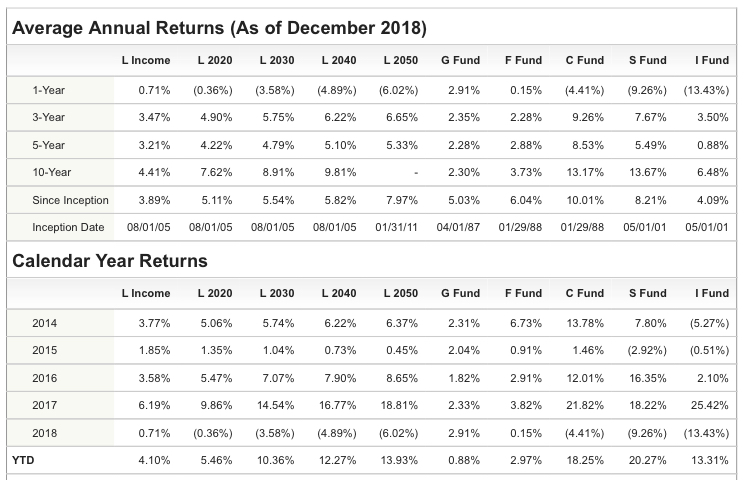 The C-Fund is a direct reflection of the S&P 500 stock index and includes S&P500 dividends. As you can see it has the highest return of the funds listed but it comes with a risk. In the event of a stock market crash, it will likely fall the most of any of the funds available. If your investing horizon is long (i.e. you’re in your 20s) it may be the best fund for you.