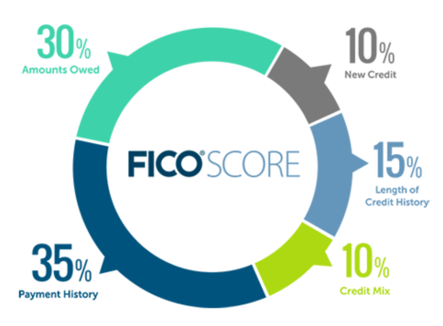 Your credit score is a number between 300 and 850 and determines whether banks will approve your for loans, lines of credit, and credit cards. Your score is determined by five factors, each with a different level of impact on your overall score. The diagram above depicts those factors. A brief description follows: