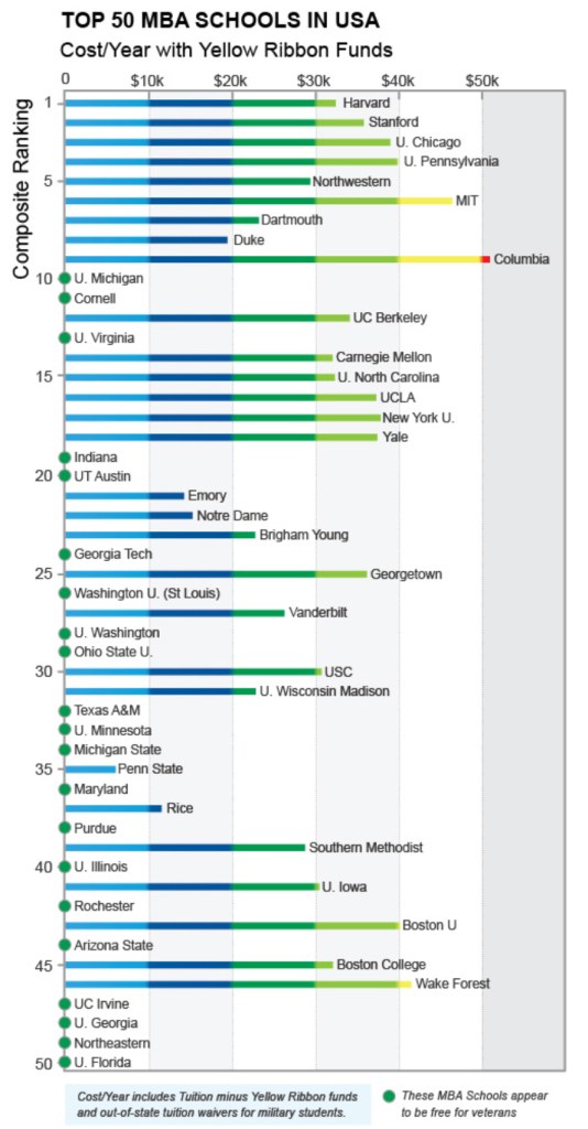 The chart above reflects the cost with yellow-ribbon program for out of state residents at each school (not including any university grants or financial aid). A green circle indicates that the Yellow-Ribbon program and G.I. Bill will cover the school’s cost entirely. While this is a good look at the average cost, you may want to discuss the actual costs with the institution prior to making significant decisions. The low end of these programs would cost you absolutely nothing for a 2-year MBA and the high end would cost around $100,000 in tuition alone.