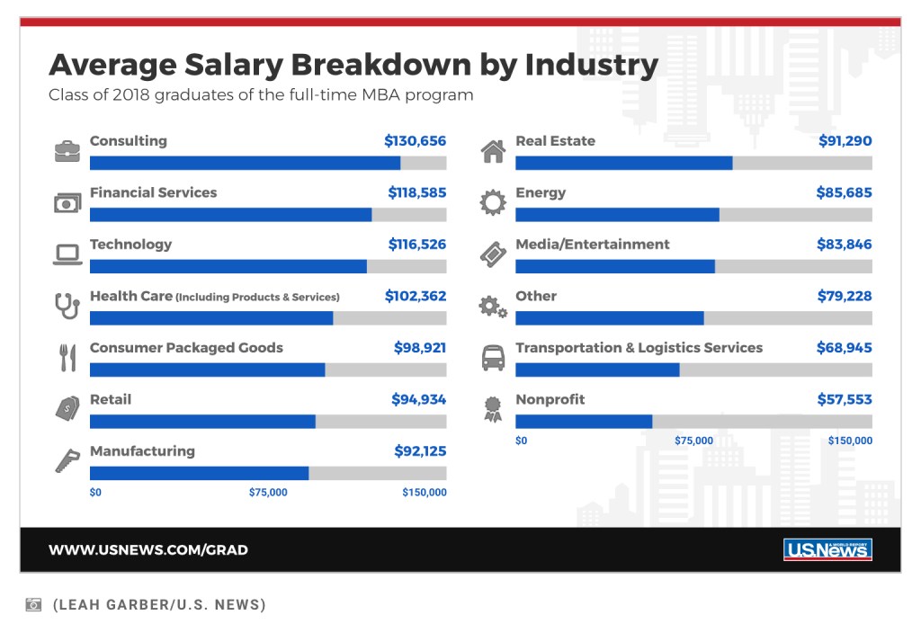 The benefits of an MBA when leaving the military are multifaceted. First, an MBA is an excellent way to transition into the business world as the program enables you to spend two years with peers from top companies around the world. The effects of being around talented peers alone could be worth the cost. Second, you gain valuable skills that you can combine with your military experience to sell to potential employers. Third, an MBA is said to double your salary according to some research — at least for those in traditional, non-military career fields. Given that we are looking at strictly financial outcomes today, we’ll take a look at what that potential salary entails.