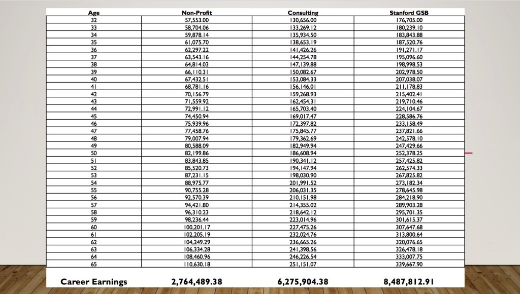 The table above details the least lucrative post-MBA career field, the most lucrative post-MBA career field, and the average salary from the top MBA program from an earnings perspective (Stanford Graduate School of Business) and sums those earnings from age 32 to age 65. As you can see, the earnings vary greatly depending on the institution you graduate from and your chosen career field. Thus, from a purely financial standpoint, you can expect to earn between $2,764,000 and $8,487,000 with a post-military MBA transition. Please remember that these numbers are based on average salaries and do not include all monetary and non-monetary benefits. At the end of the day, it is important that you choose a career or path that is right for you!