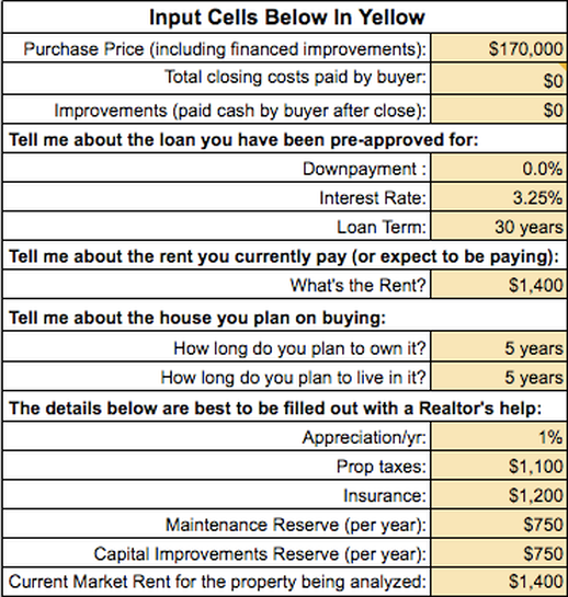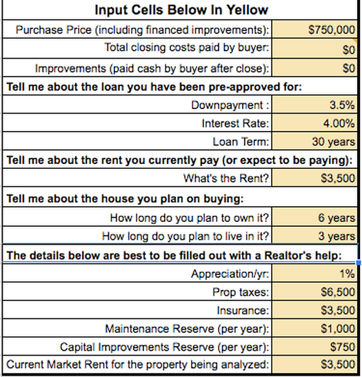 Let’s look at two example rent vs own calculations. In the first case, our prospective buyer wants to live in the heart of downtown Savannah. He’ll need a three bedroom townhouse. He’s got decent credit and will be using a FHA loan, which means he will make a down payment of 3.5%. The place is gorgeous and won’t require any repairs, and our buyer plans on asking for all his closing costs to be paid by the seller. He plans to live in Savannah for three years, and will probably sell after six. Let’s check out some screenshots from the Microsoft excel spreadsheet I use to run my rent vs own calculations to see if our friend should rent or buy.