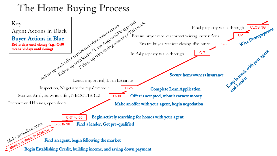 Buying a house is a big deal and there’s a lot that goes into it, but if we break the process down into its individual steps it starts to look much easier. Check out the chart below that illustrates the process of becoming a first time homebuyer. Blue text is steps that you will need to take, and the text in black is what your agent will take care of on your behalf. The red arrow running diagonally from bottom left to top right is your timeline, starting months (or years) in advance and culminating at the closing table when you get the keys to your new home.